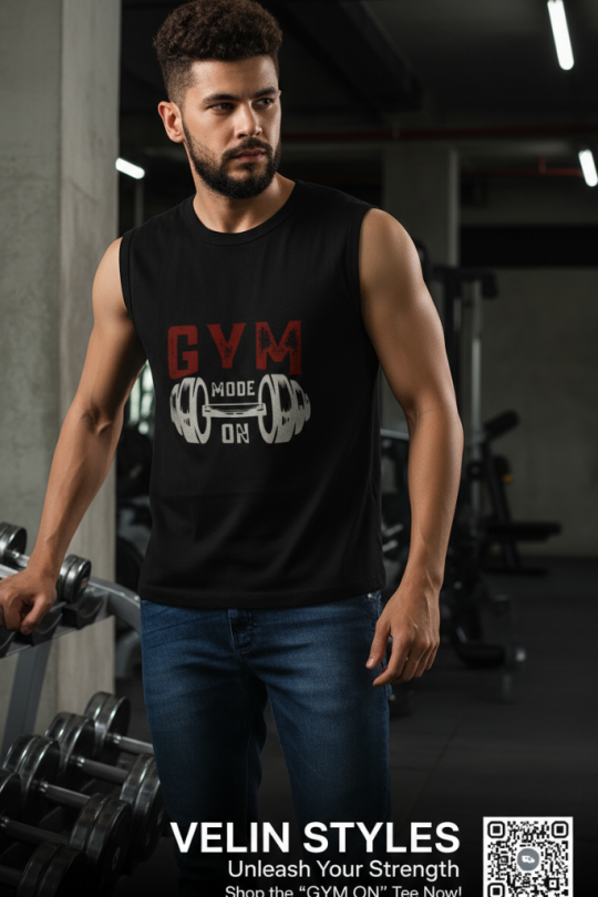 This powerful shot captures the essence of strength, style, and confidence. A determined young man stands inside a modern gym, showcasing his fit physique and focus, perfectly embodying the spirit of dedication and hard work. He’s wearing the bold “GYM MODE ON” sleeveless tee from Velin Styles, a statement piece designed for fitness enthusiasts who refuse to settle for anything less than their best.