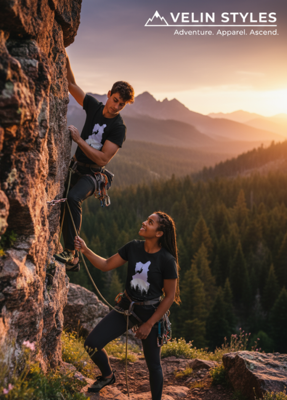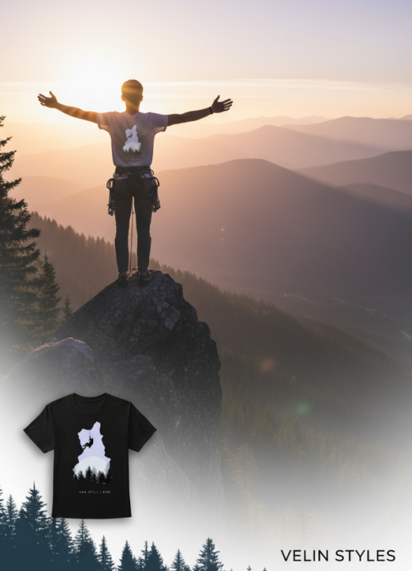 At the heart of the design is a bold graphic print: a silhouette of a climber suspended on ropes, ascending against the odds. The climber is positioned on a jagged rock silhouette, symbolizing life’s unpredictable journey. Behind the figure, a radiant lavender-toned circle, reminiscent of the moon or rising sun, illuminates the design, creating a sense of hope and new beginnings. At the base, a forest of evergreens stretches across, signifying growth, endurance, and nature’s resilience. Beneath this artwork lies the empowering phrase “AND STILL I RISE”, a reminder of perseverance no matter how steep the climb.