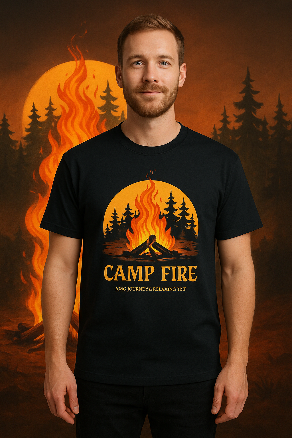 Designed with a bold and eye-catching graphic of a roaring fire against a serene forest backdrop, this piece blends comfort with creativity, making it perfect for every explorer, dreamer, and nature lover. The deep black base of the T-shirt highlights the vibrant orange and golden tones, giving it a unique, standout appeal whether you’re outdoors by the fire or in the city making a statement.