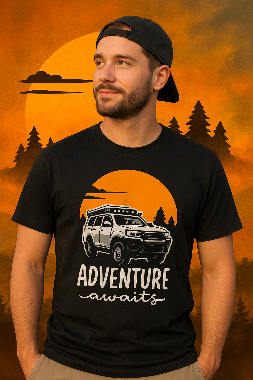 Life is a journey, and every journey begins with a choice: the choice to step outside your comfort zone and embrace the unknown. The design you see here isn’t just about fashion—it’s about fueling that fire of curiosity, wanderlust, and courage that lives inside all of us. With the bold phrase “Adventure Awaits” set against a radiant orange sunset backdrop and the powerful image of an off-road SUV ready to conquer any terrain, this T-shirt by Velin Styles captures the essence of freedom and exploration.