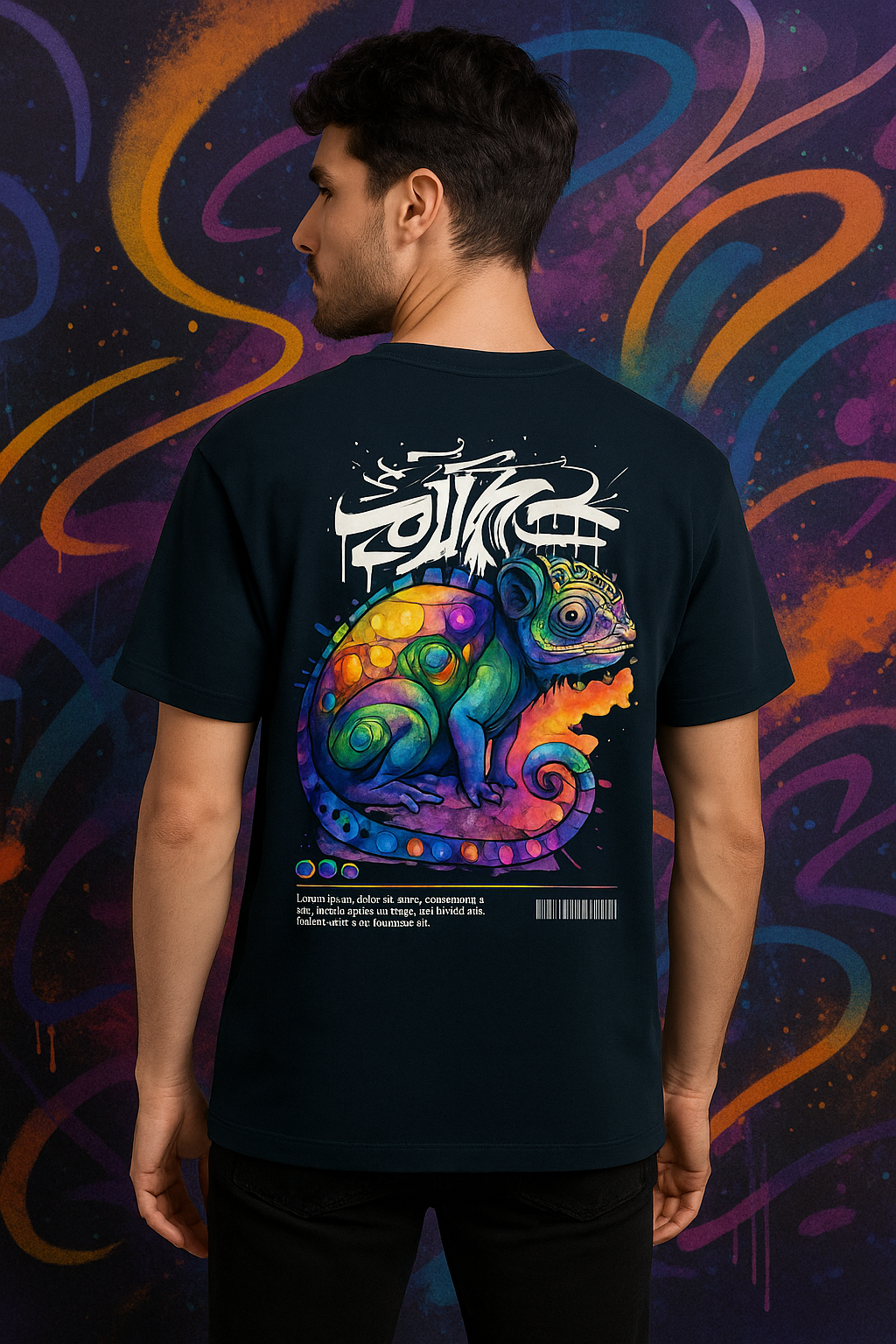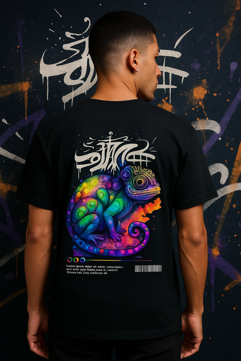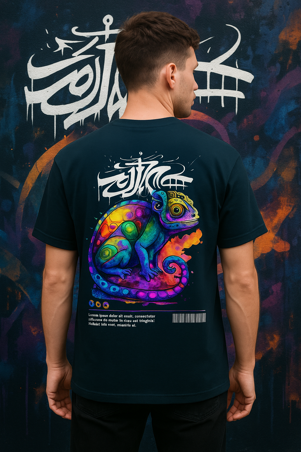 The background in this image amplifies the impact. The graffiti wall isn’t just a backdrop—it’s an extension of the shirt itself. The colors from the wall blend seamlessly into the hues of the chameleon, creating a powerful synergy that makes the entire ad pop. This isn’t just fashion—it’s art in motion.