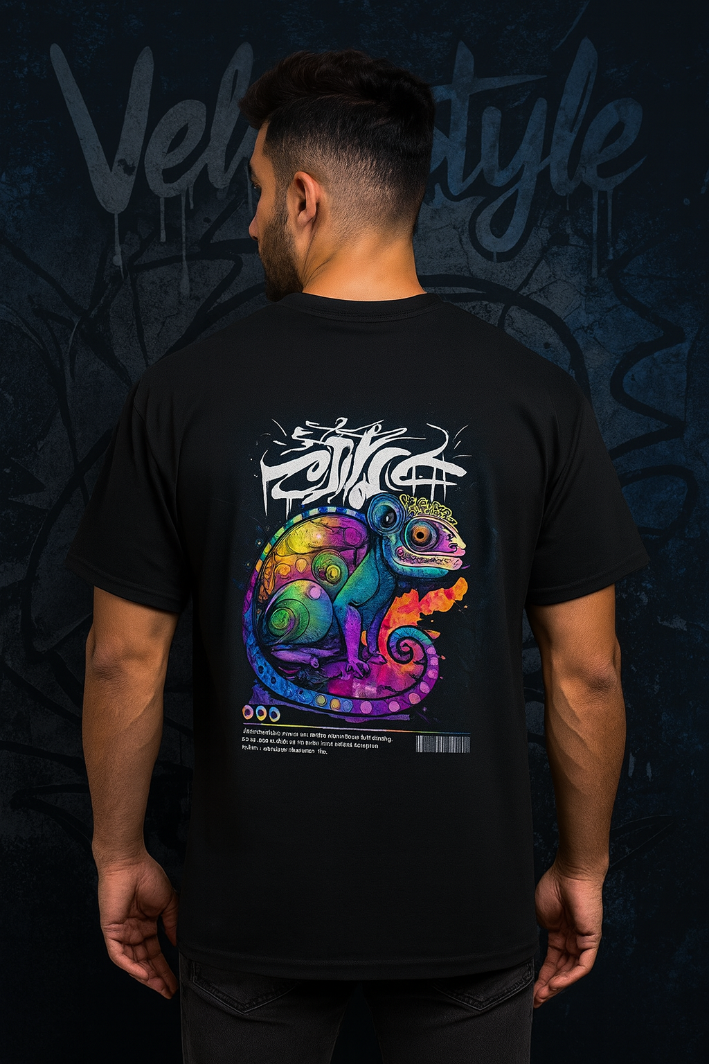 Look at the model in this campaign. His casual yet confident stance emphasizes the design on the back of the tee, making it the focal point of the entire image. The graffiti background mirrors the art on the shirt, creating a surreal, immersive atmosphere. It’s almost as if the chameleon has leapt off the wall and onto the shirt—blurring the line between art, fashion, and lifestyle.