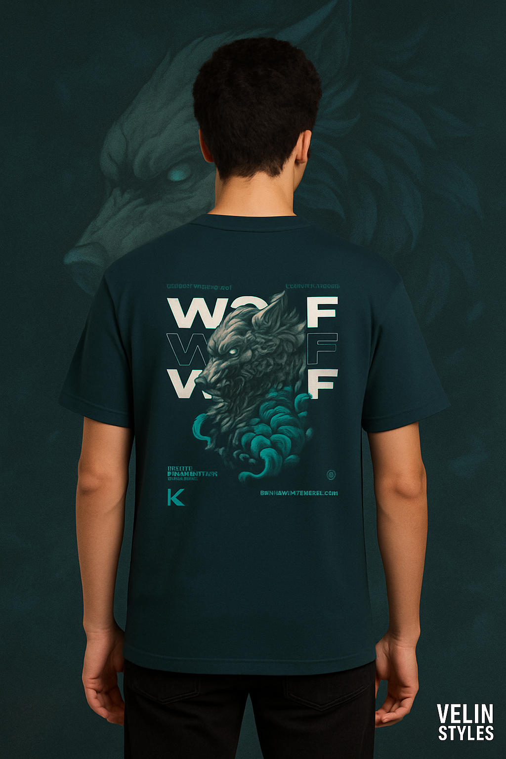The wolf graphic is detailed in vibrant teal tones with glowing eyes and swirling textures, set against layered typography that repeats the word “WOLF”. This repetition is more than design—it’s a call to embrace your alpha energy, to push forward with relentless drive, and to wear your confidence on your back.