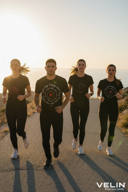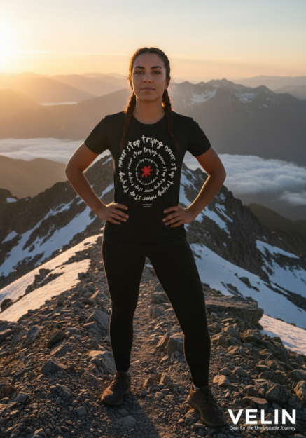 The overall composition blends fashion with motivation, presenting Velin not just as a clothing brand, but as a symbol of resilience, lifestyle, and personal growth. This campaign-style image captures the essence of what Velin stands for: inspiring individuals to keep moving forward, no matter the challenge.