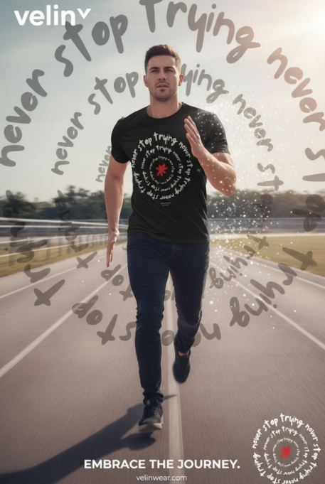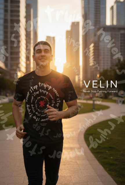 This promotional image captures the spirit of motivation and endurance, featuring a male model in motion, confidently running on an open track. He is dressed in a sleek black T-shirt by Velin, adorned with the bold and artistic design that spirals the inspiring phrase “never stop trying” repeatedly, leading into a central red star-like symbol. The repetition of the message forms a powerful visual, reinforcing resilience and determination, qualities that align perfectly with the lifestyle ethos of the Velin brand.