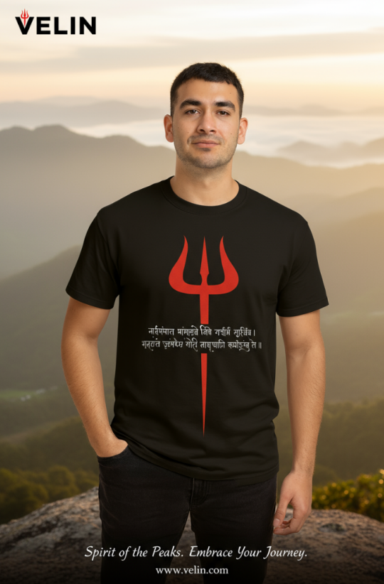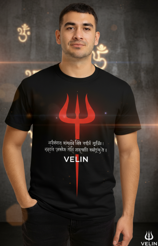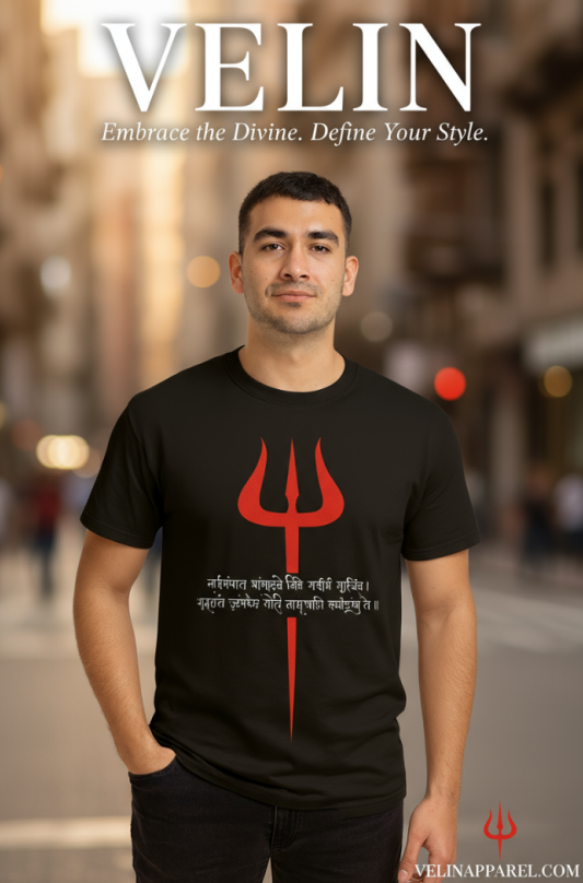 The deep black fabric of the T-shirt creates a stark contrast, making the red Trishul and white Sanskrit script stand out with intensity. The model, with a calm yet confident expression, enhances the aura of strength and devotion projected by the design. His casual yet composed posture, with hands relaxed in pockets, blends modern fashion with traditional spirituality.